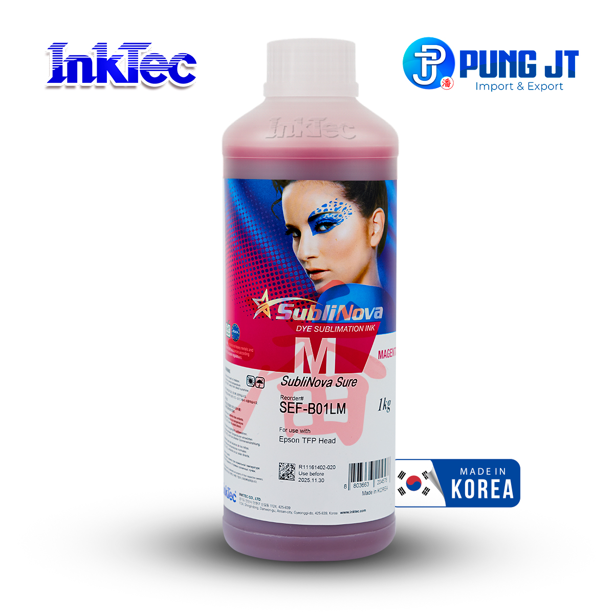 Light Magenta Dye Sublimation InkTec SubliNova Sure SEF‑B01LM (1 L) para cabezales Epson TFP, DX5 y DX7. Ideal para colores vibrantes, degradados suaves y flujo continúa sin obstrucciones. Compatible con Epson SureColor y plotters gran formato.